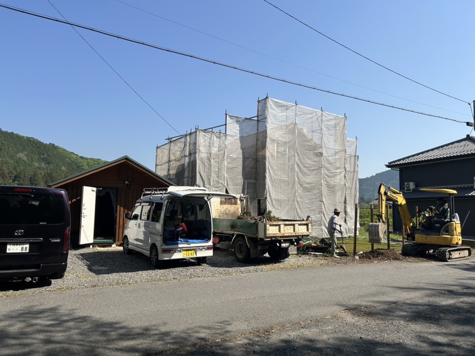 足場を設置し、まずは外壁と屋根、外構の工事から進めています。