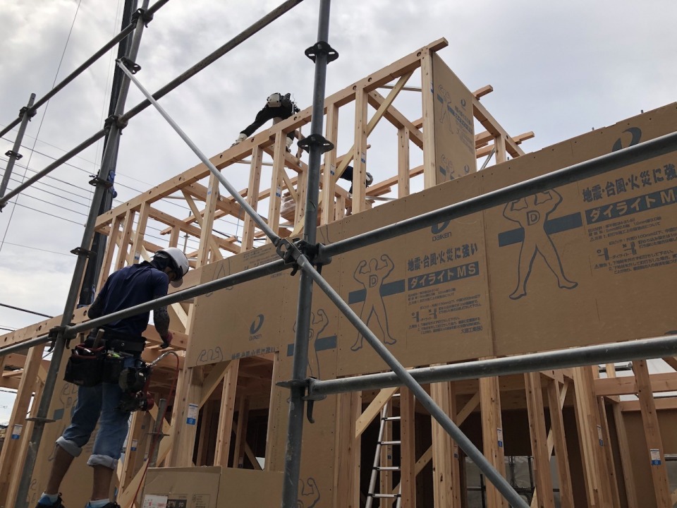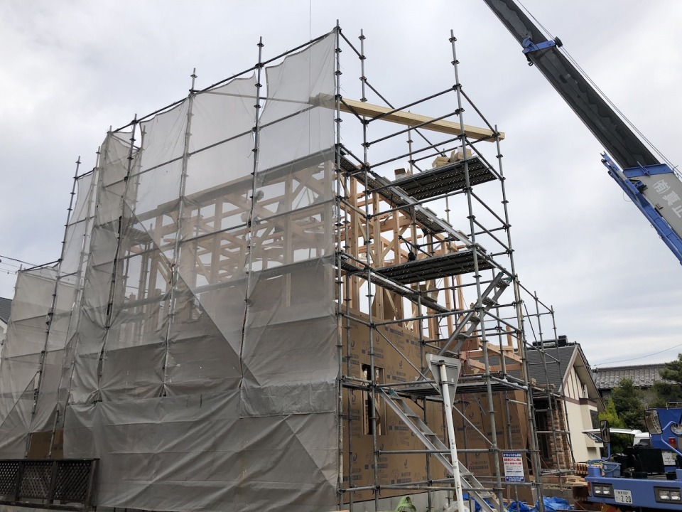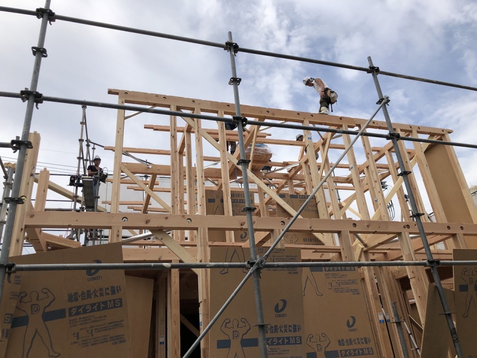 地鎮祭、地盤改良工事、基礎工事と順調に進み、大安の本日、いよいよ上棟です。
