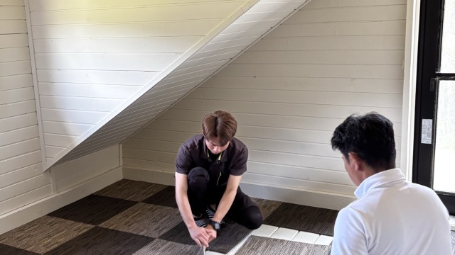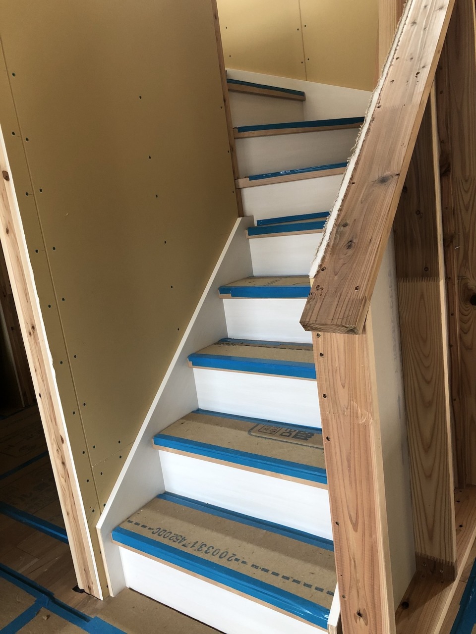 今日は階段の設置。腰壁の形状や階段下収納の使い方などをA様と打ち合わせ、丁寧に施工していきます。