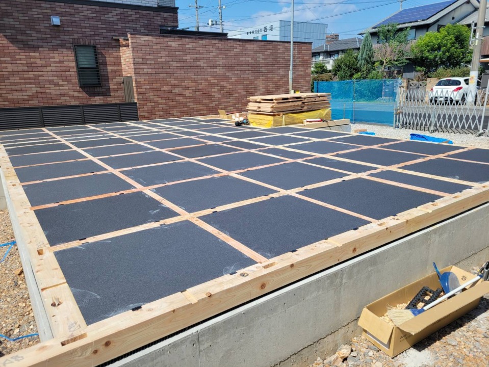 土台は基礎の上に最初に乗る木材で、文字通り、住宅を支える重要な役割を果たします。井桁の形に組み上がったその土台に鋼床を敷き、雨仕舞をして土台伏せが完了です。