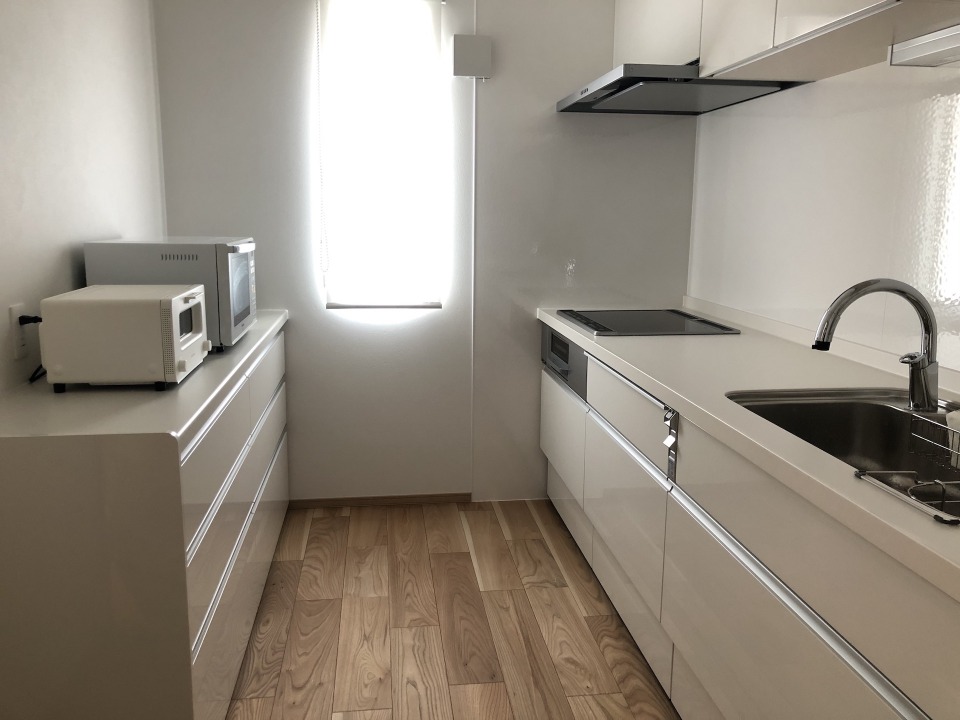 キッチンは家電も含めて、ホワイトで統一しました。「前の住まいはデザイン重視で輸入キッチンを選びましたが、年齢を重ねた今は掃除やお手入れのしやすさ、使い勝手が一番(笑)」と奥様。いくつかショールームを回られ、機能の進化にも驚かれたそうです。