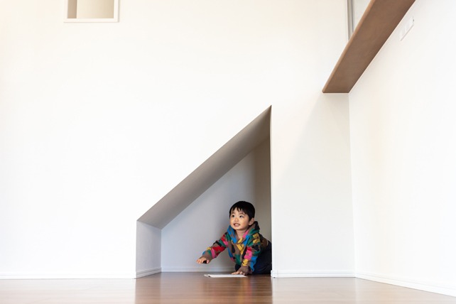 ご家族のメインスペースとなる1階のLDKは、奥様とお母様が何度もショールームに足を運び、決めた白い対面式キッチンが主役。料理をしながらリビングで遊ぶお子さまたちを見守ることができ、家事もはかどりそうです。階段下を利用したスペースにはオモチャ類を収納する予定。壁を三角にくり抜いた空間はお子さまたちの「隠れ家」になるかもしれません。